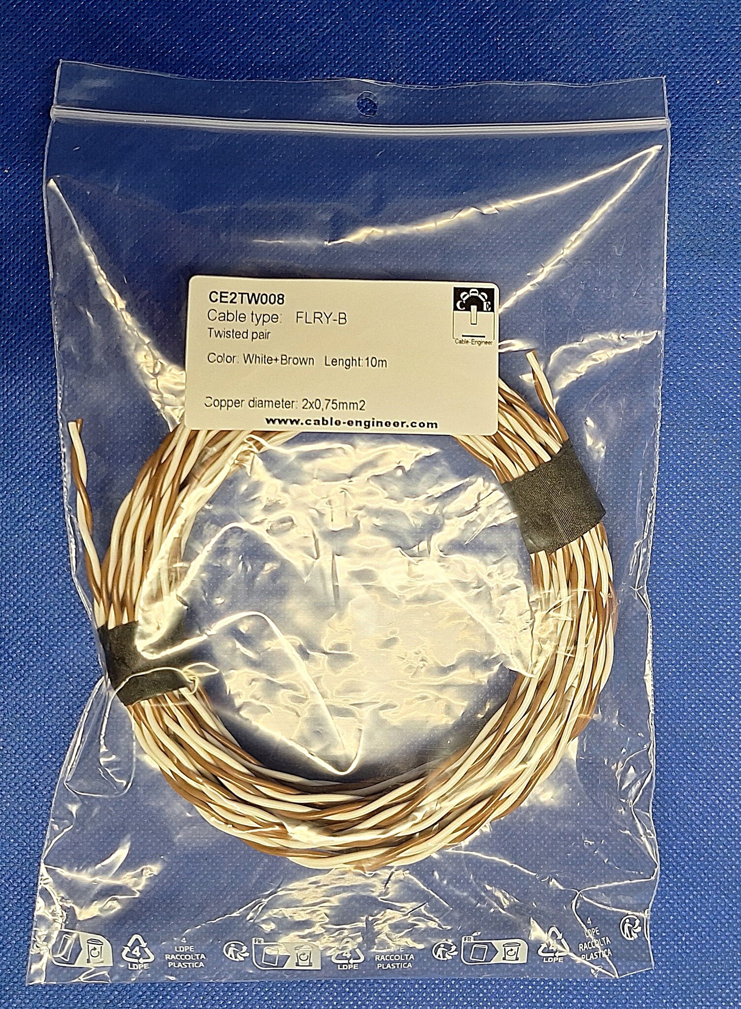 2x 0,75 mm2 Twisted Pair FLRY-B kabel in de kleur Bruin/Wit verpakt per 10 meter. FLRY-B kabel is zeer flexibel en bestand tegen hitte, koude, oliën, chemicaliën, brandstoffen en gedraaid om elektromagnetische storingen te voorkomen.