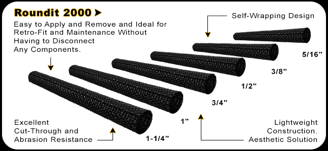 Roundit 2000 38-0: 38mm zelfsluitende, gevlochten vlechtkous van Polyester met extra versterking met polyester strengen met gebruikstemperatuur van -70ºC to +125ºC en achteraf aan te brengen of draden, kabels, slangen en buizen. Rol met 25 meter