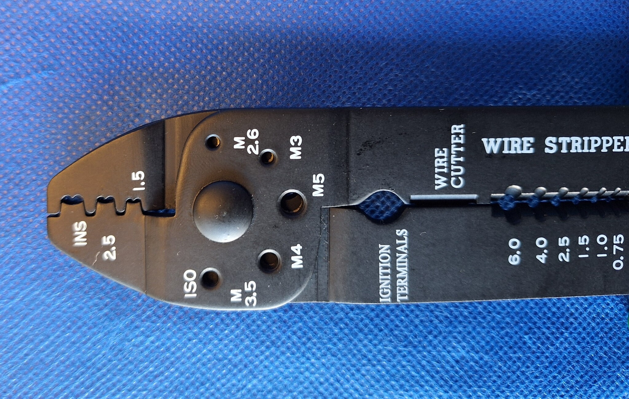 Simpele AMP tang uit Japan met kabelstripper, draadknipper en krimpgedeelte voor open-barrel contacten en terminal.