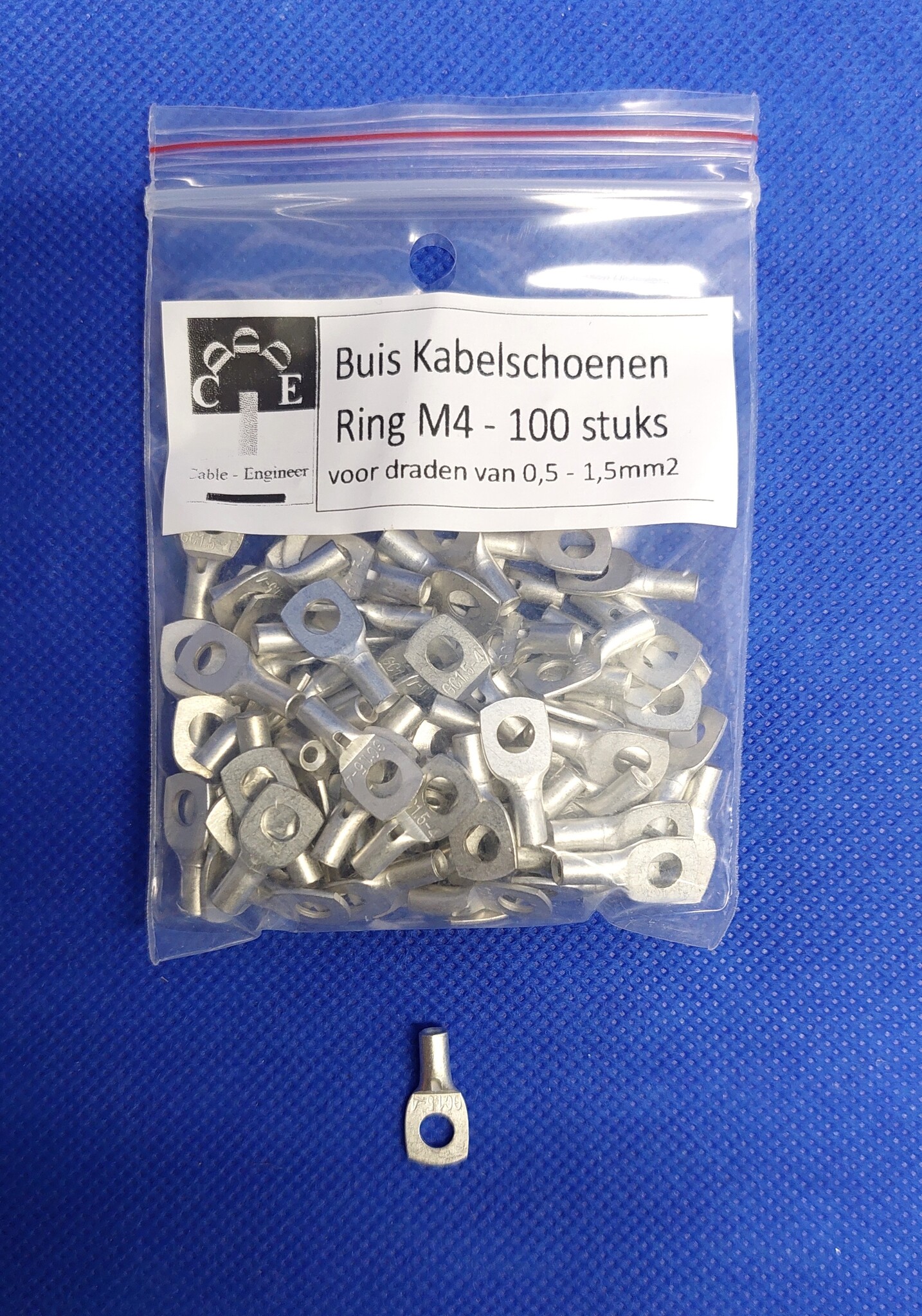 M4 buiskabelschoenen met inspectie-gat voor kabels en draden van 0,5 t/m 1,5mm2 - verpakt per 100 stuks in zipper-bag. Deze kabelogen zijn gemaakt van koper en bedekt met een laagje tin om het oppervlakte te beschermen tegen corrosie.