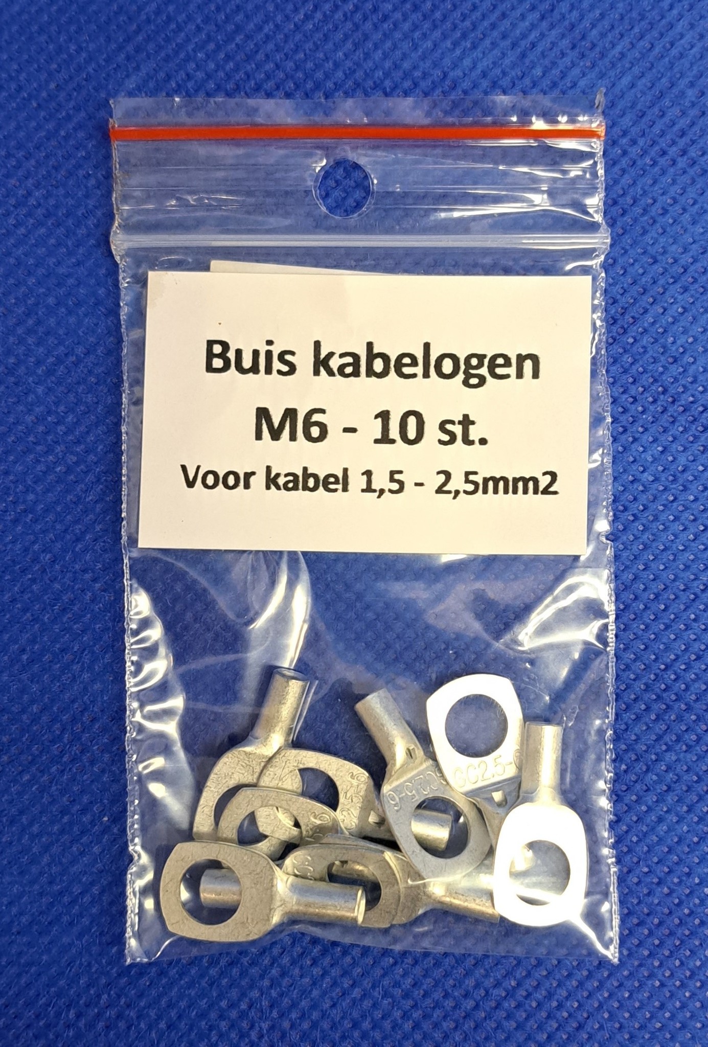 M6 buiskabelschoenen met inspectie-gat voor kabels en draden van 1,5 t/m 2,5mm2 - verpakt per 10 stuks in zipper-bag. Deze kabelogen zijn gemaakt van koper en bedekt met een laagje tin om het oppervlakte te beschermen tegen corrosie.