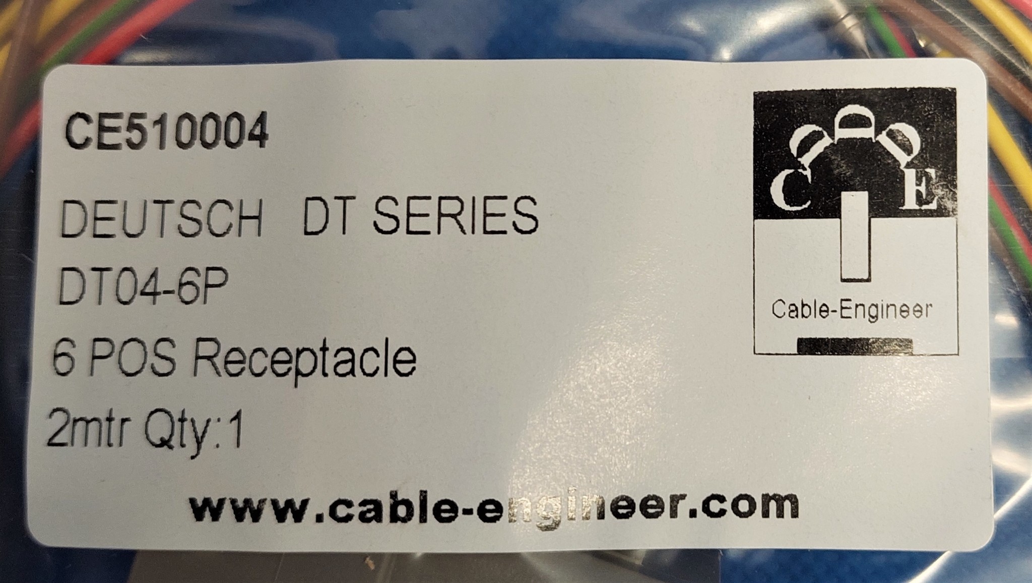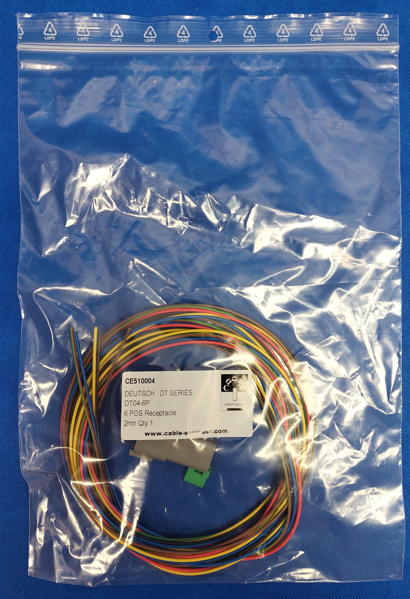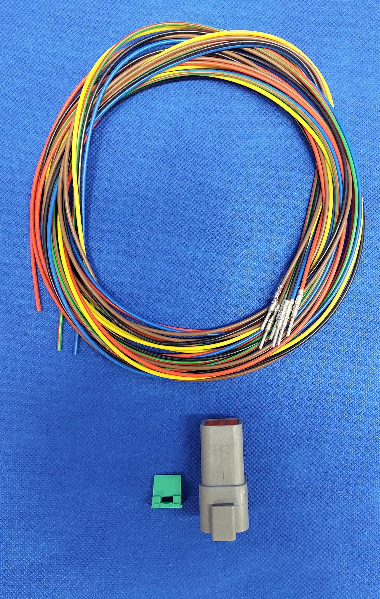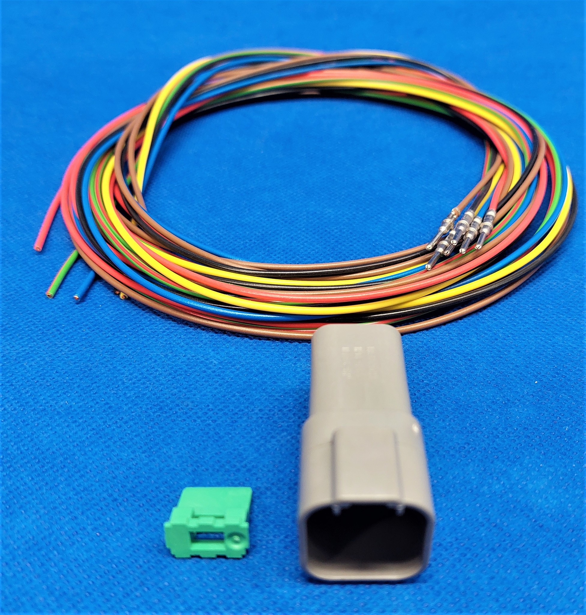 Complete Deutsch DT Pigtail-set met Deutsch DT 6-Pos. Receptacle (vrouw) connector)+ 6x 2 meter 0,75mm2 FLRY-B kabel in de kleuren rood, zwart, blauw, bruin, geel, en rood/groen met professioneel aangekrompen vrouwelijke contacten(nikkel) en bijbehorende wedgelock voor het vastzetten en exact uitlijnen van de contacten in de behuizing.