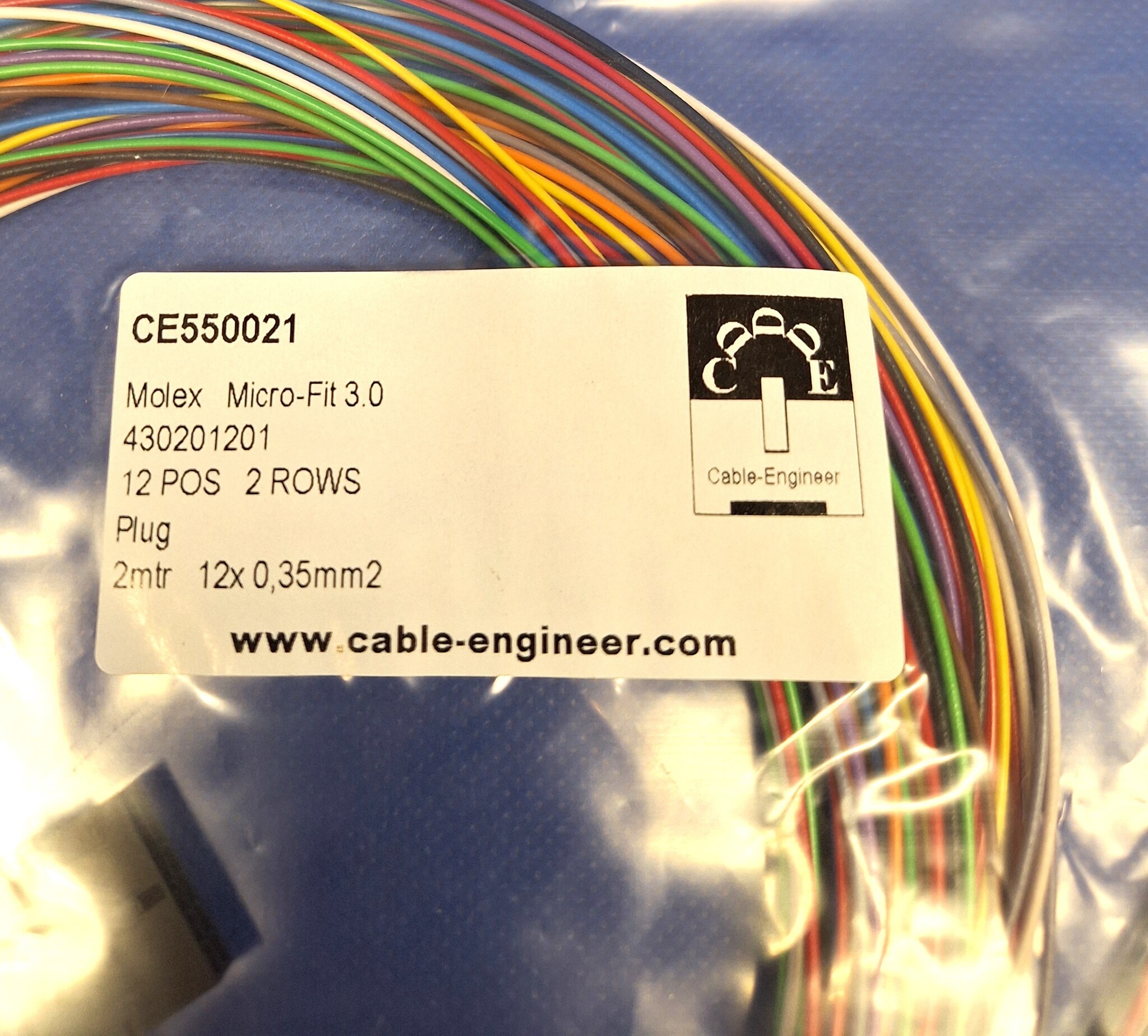 Kant en klare set, klaar voor gebruik van Molex Micro Fit 3.0 Serie. Complete set met Molex Micro Fit 3.0 Plug Housing - 12-posities - 2-rij compleet met 12x 2 meter FLRY-A kabel van 0,35mm2 en pre-crimped contacten aan de kabel