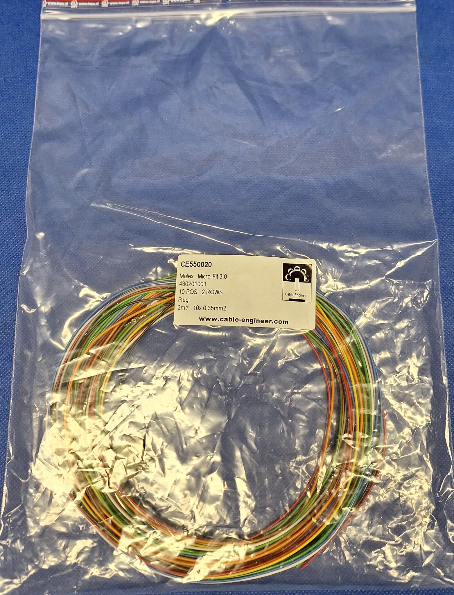 Kant en klare set, klaar voor gebruik van Molex Micro Fit 3.0 Serie. Complete set met Molex Micro Fit 3.0 Plug Housing - 10-posities - 2-rij compleet met 8x 2 meter FLRY-A kabel van 0,35mm2 en pre-crimped contacten aan de kabel