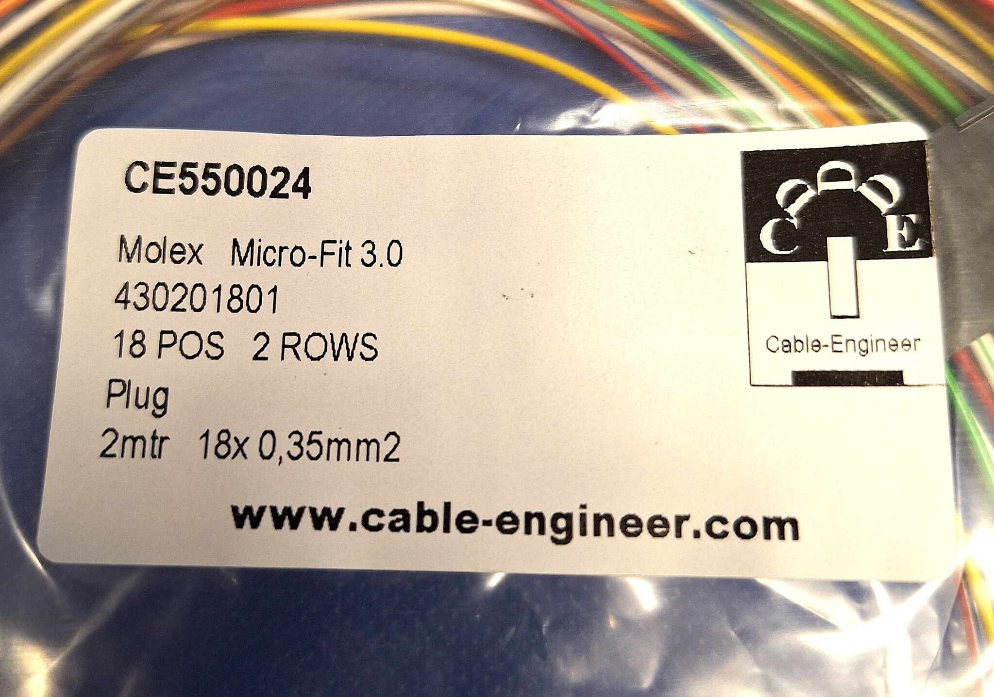 Kant en klare set, klaar voor gebruik van Molex Micro Fit 3.0 Serie. Complete set met Molex Micro Fit 3.0 Plug Housing - 18-posities - 2-rij compleet met 18x 2 meter FLRY-A kabel van 0,35mm2 en pre-crimped contacten aan de kabel