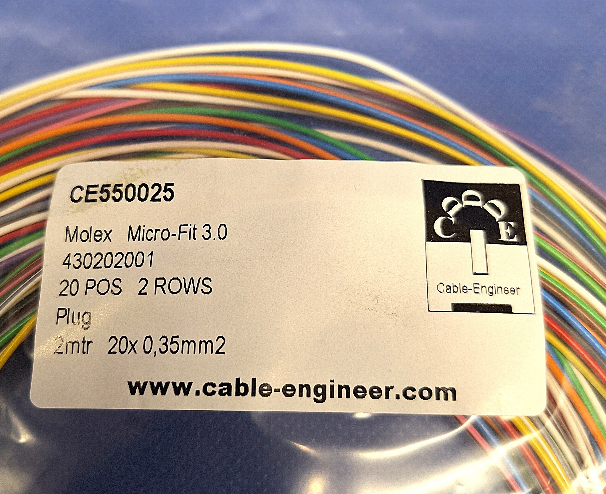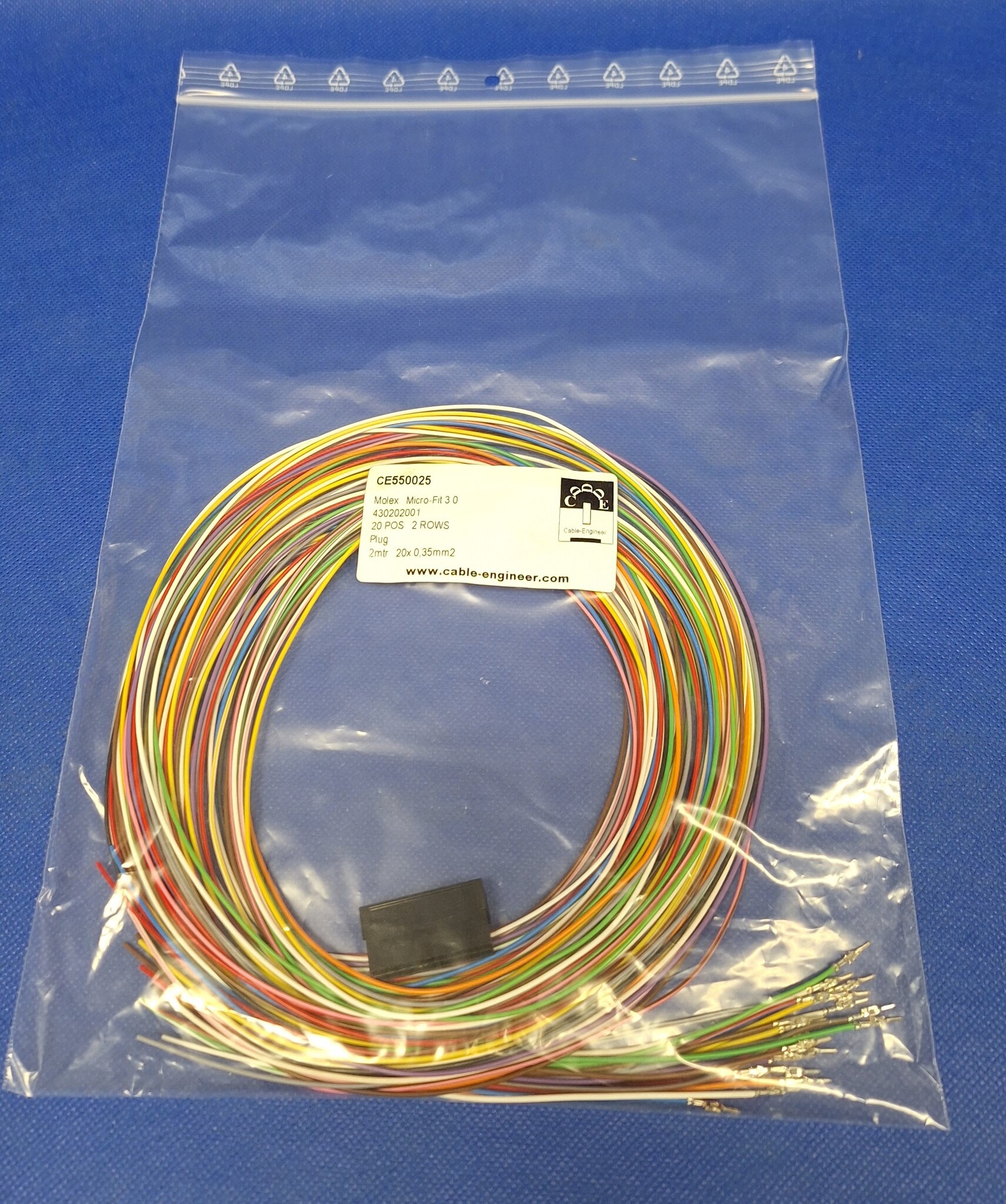 Kant en klare set, klaar voor gebruik van Molex Micro Fit 3.0 Serie. Complete set met Molex Micro Fit 3.0 Plug Housing - 20-posities - 2-rij compleet met 20x 2 meter FLRY-A kabel van 0,35mm2 en pre-crimped contacten aan de kabel