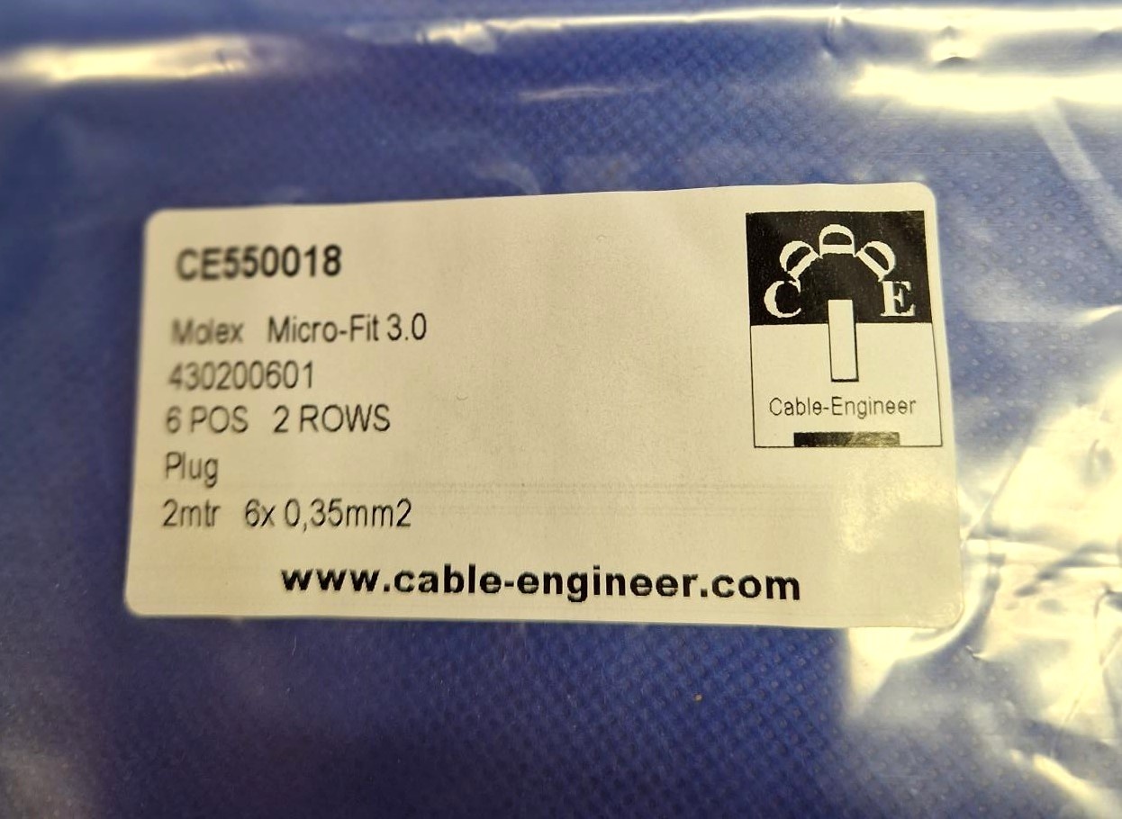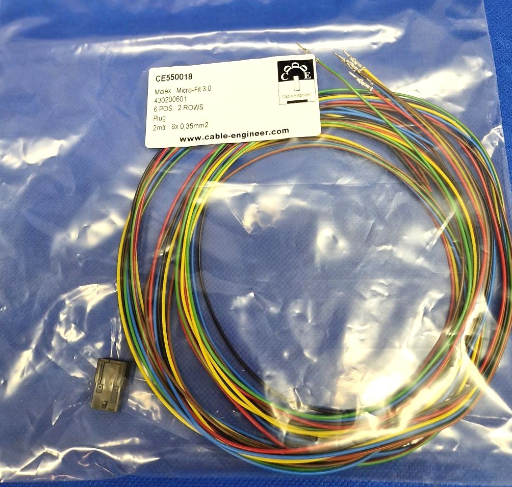 Kant en klare set, klaar voor gebruik van Molex Micro Fit 3.0 Serie. Complete set met Molex Micro Fit 3.0 Plug Housing - 6-posities - 2-rij compleet met 6x 2 meter FLRY-A kabel van 0,35mm2 en pre-crimped contacten aan de kabel
