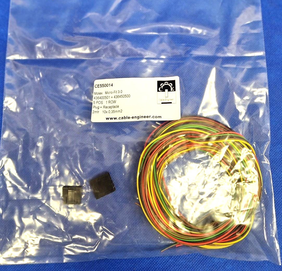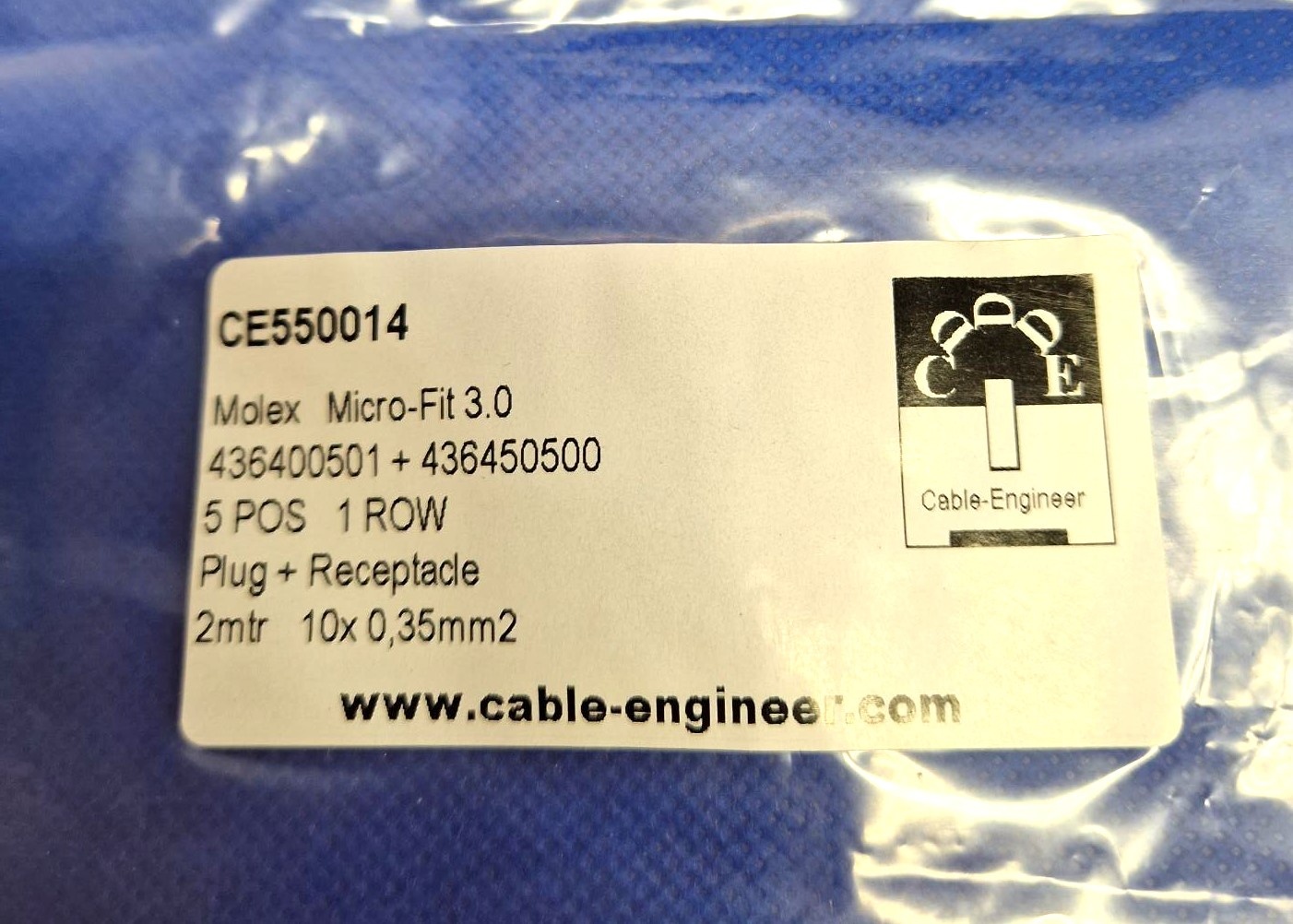 Kant en klare set, klaar voor gebruik van Molex Micro Fit 3.0 Serie. Complete set met Molex Micro Fit 3.0 Plug & Receptacle Housing - 5-Posities - 1-rij compleet met 10x 2 meter FLRY-A kabel van 0,35mm2 en pre-crimped contacten aan de kabel