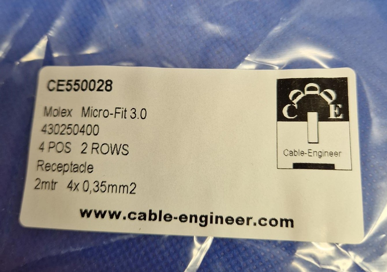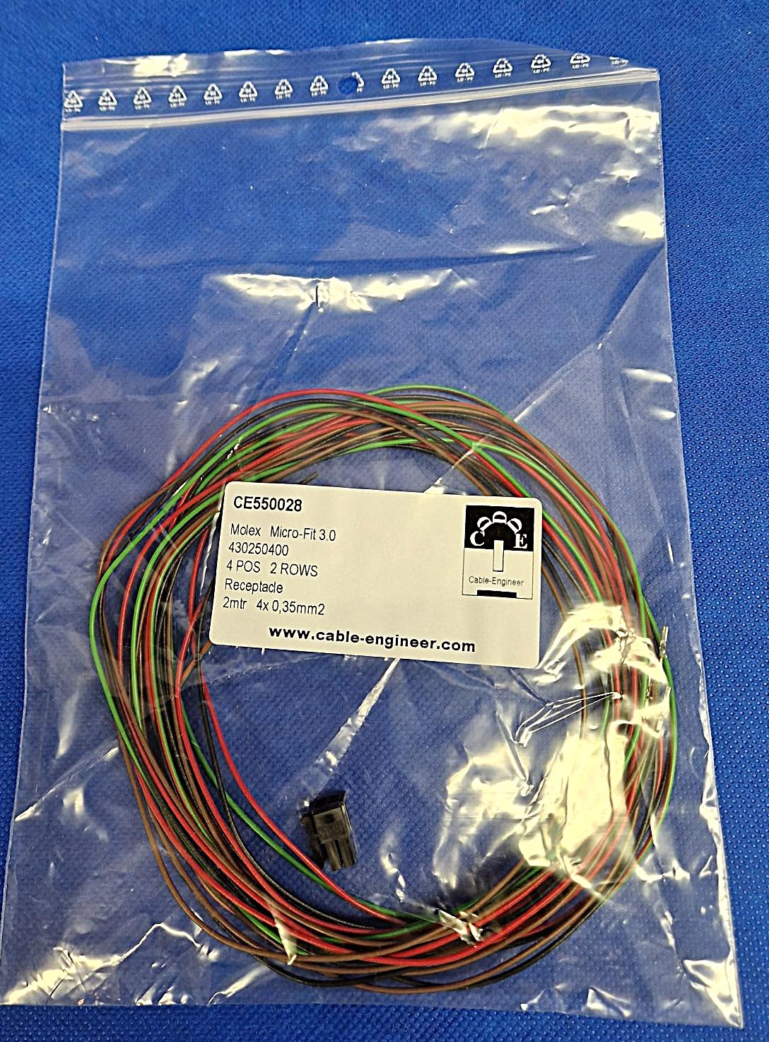 Kant en klare set, klaar voor gebruik van Molex Micro Fit 3.0 Serie. Complete set met Molex Micro Fit 3.0 Receptacle Housing - 4-posities - 2-rij compleet met 4x 2 meter FLRY-A kabel van 0,35mm2 en pre-crimped contacten aan de kabel