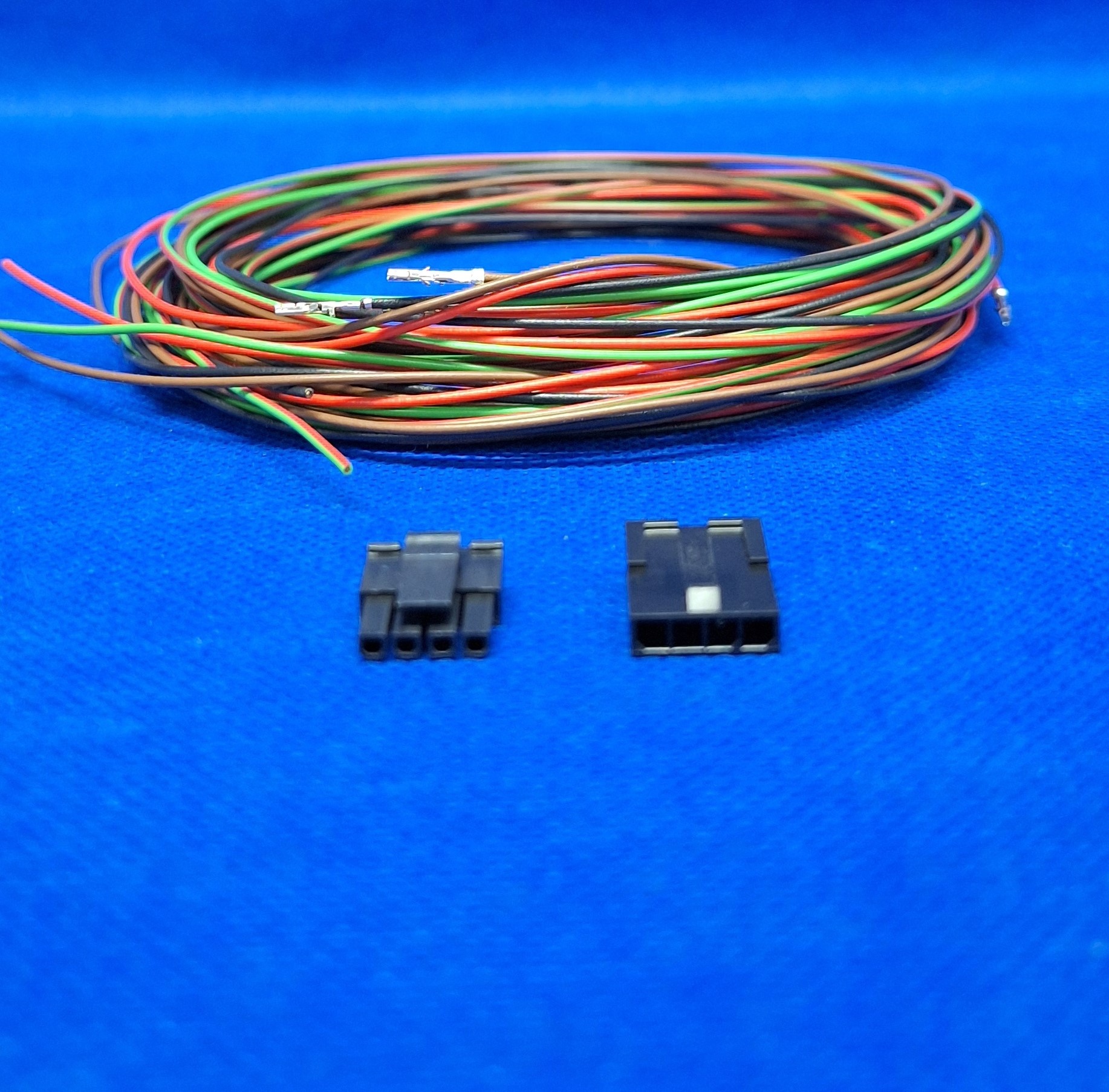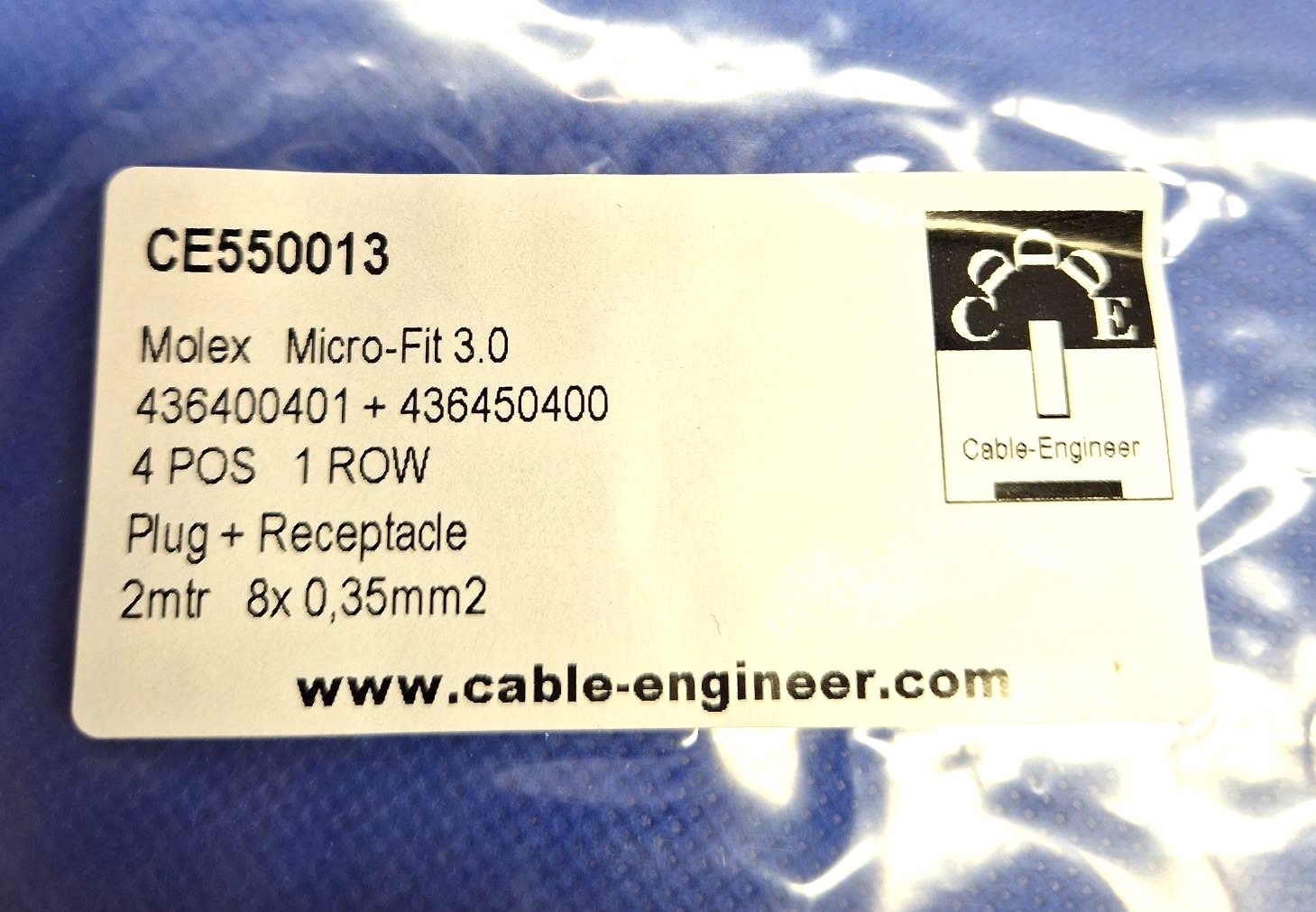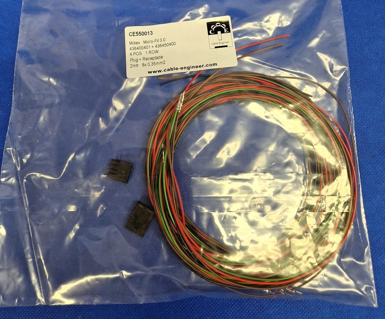 Kant en klare set, klaar voor gebruik van Molex Micro Fit 3.0 Serie. Complete set met Molex Micro Fit 3.0 Plug & Receptacle Housing - 4-Posities - 1-rij compleet met 8x 2 meter FLRY-A kabel van 0,35mm2 en pre-crimped contacten aan de kabel