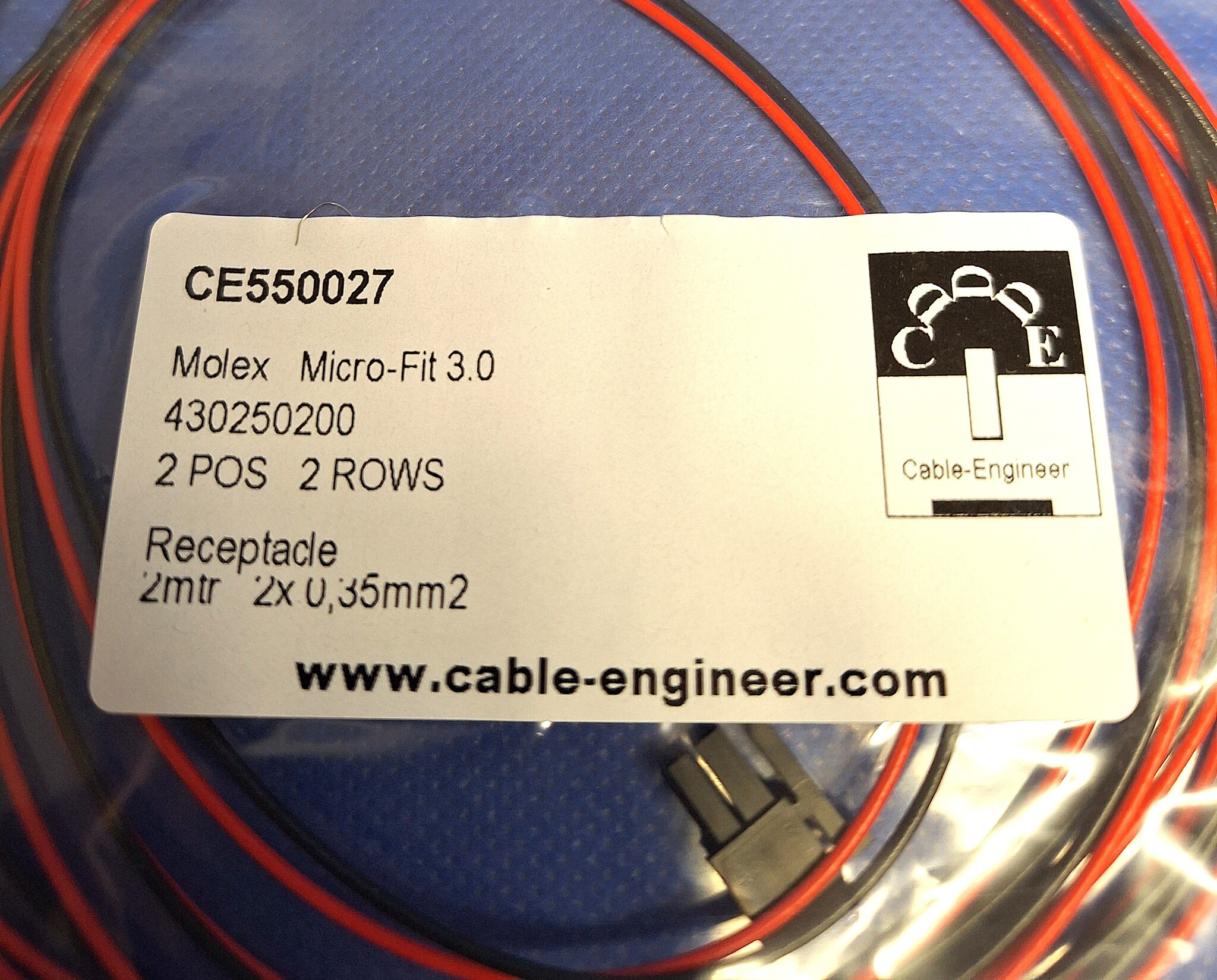 Kant en klare set, klaar voor gebruik van Molex Micro Fit 3.0 Serie. Complete set met Molex Micro Fit 3.0 Receptacle Housing - 2-posities - 2-rij compleet met 2x 2 meter FLRY-A kabel van 0,35mm2 en pre-crimped contacten aan de kabel
