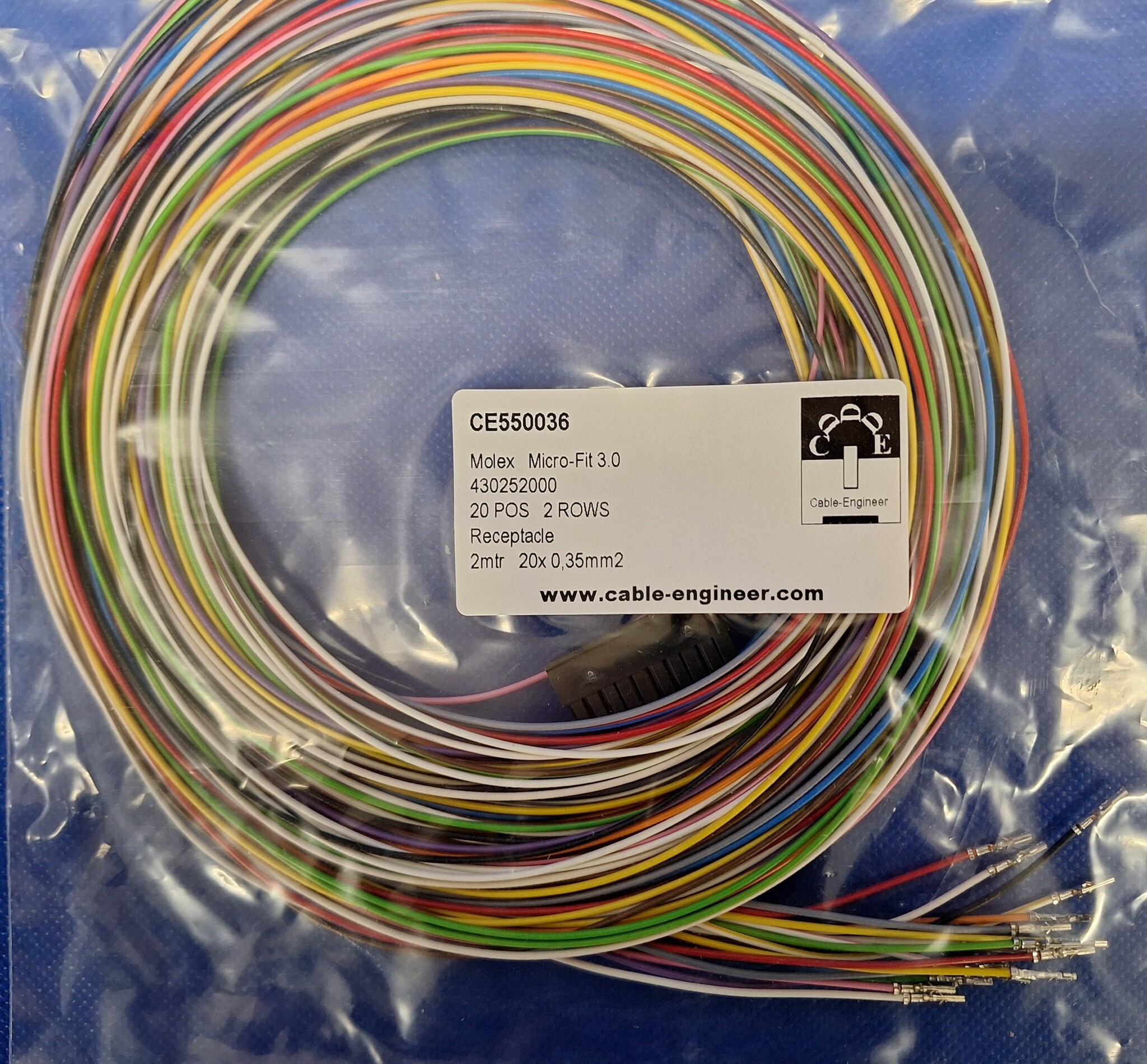 Kant en klare set, klaar voor gebruik van Molex Micro Fit 3.0 Serie. Complete set met Molex Micro Fit 3.0 Receptacle Housing - 20-posities - 2-rij compleet met 20x 2 meter FLRY-A kabel van 0,35mm2 en pre-crimped contacten aan de kabel