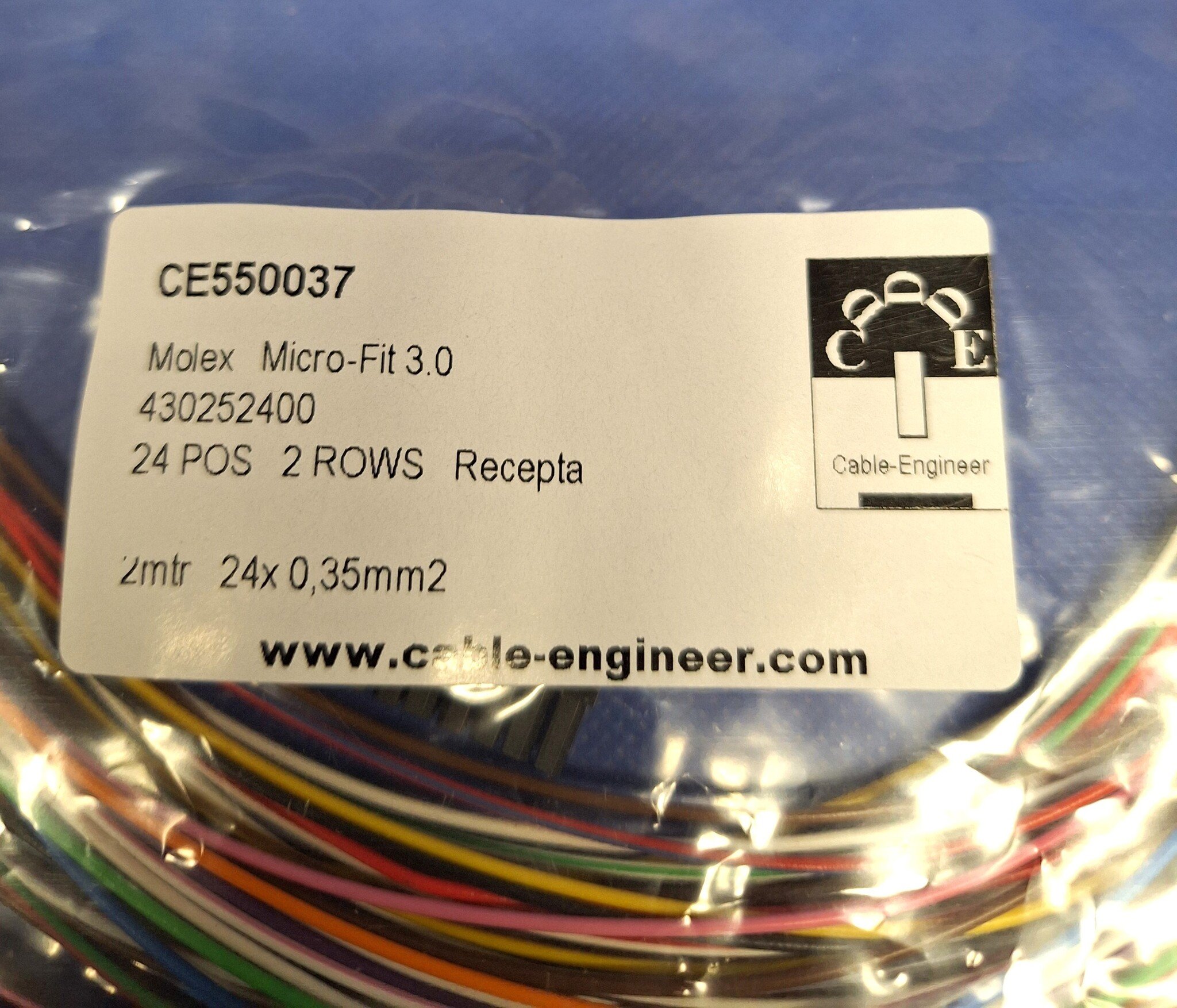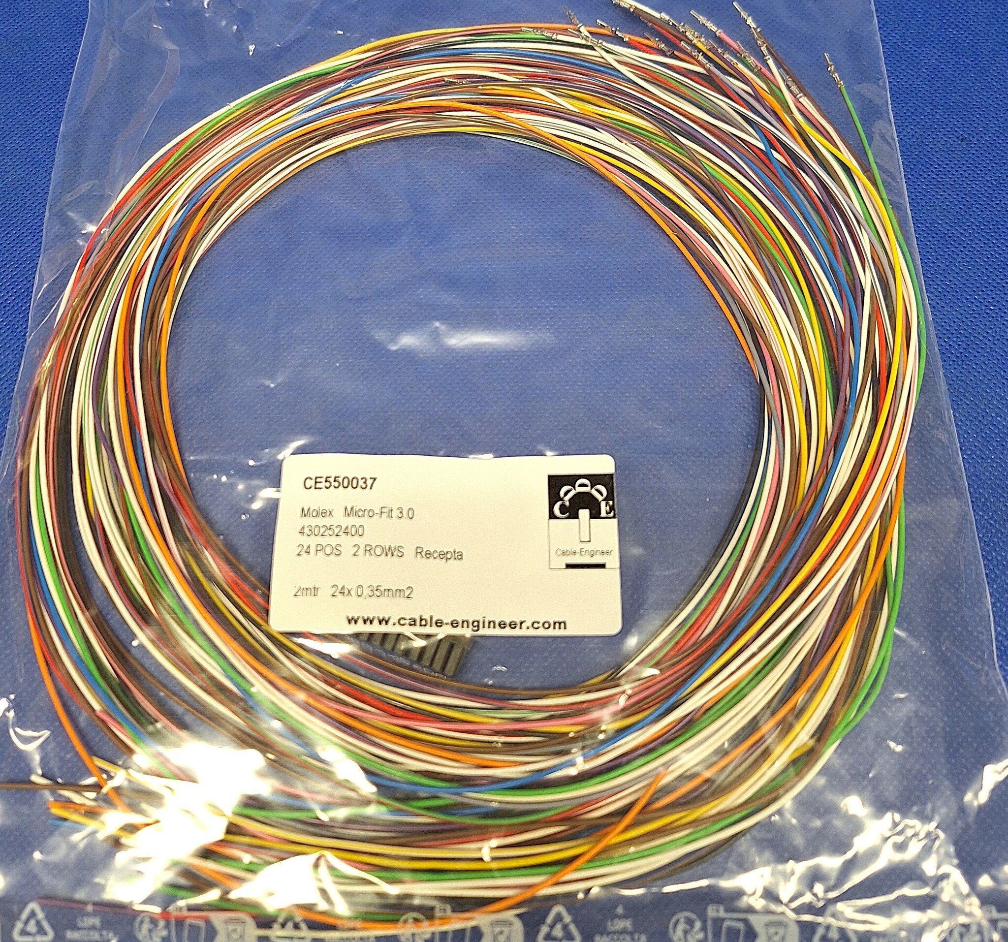 Kant en klare set, klaar voor gebruik van Molex Micro Fit 3.0 Serie. Complete set met Molex Micro Fit 3.0 Receptacle Housing - 24-posities - 2-rij compleet met 20x 2 meter FLRY-A kabel van 0,35mm2 en pre-crimped contacten aan de kabel