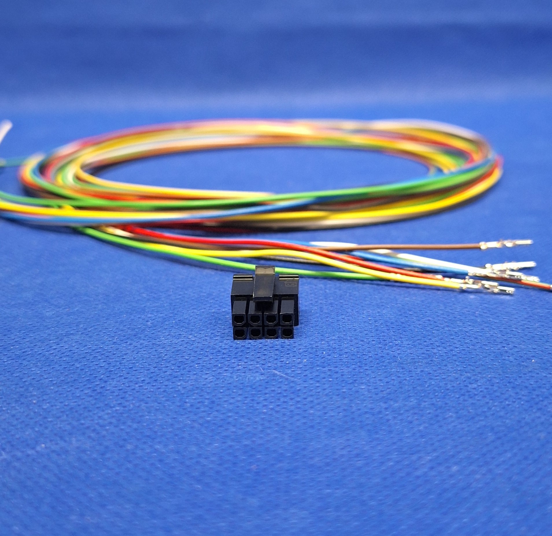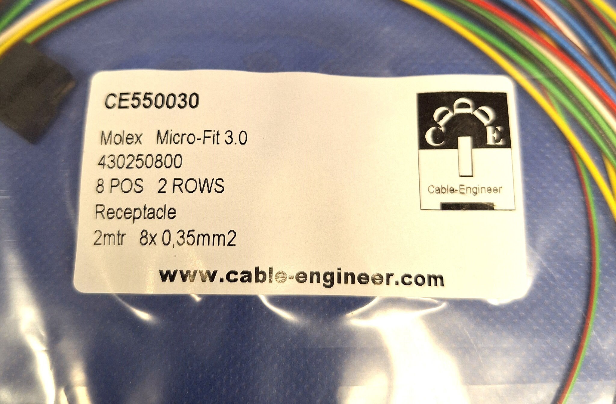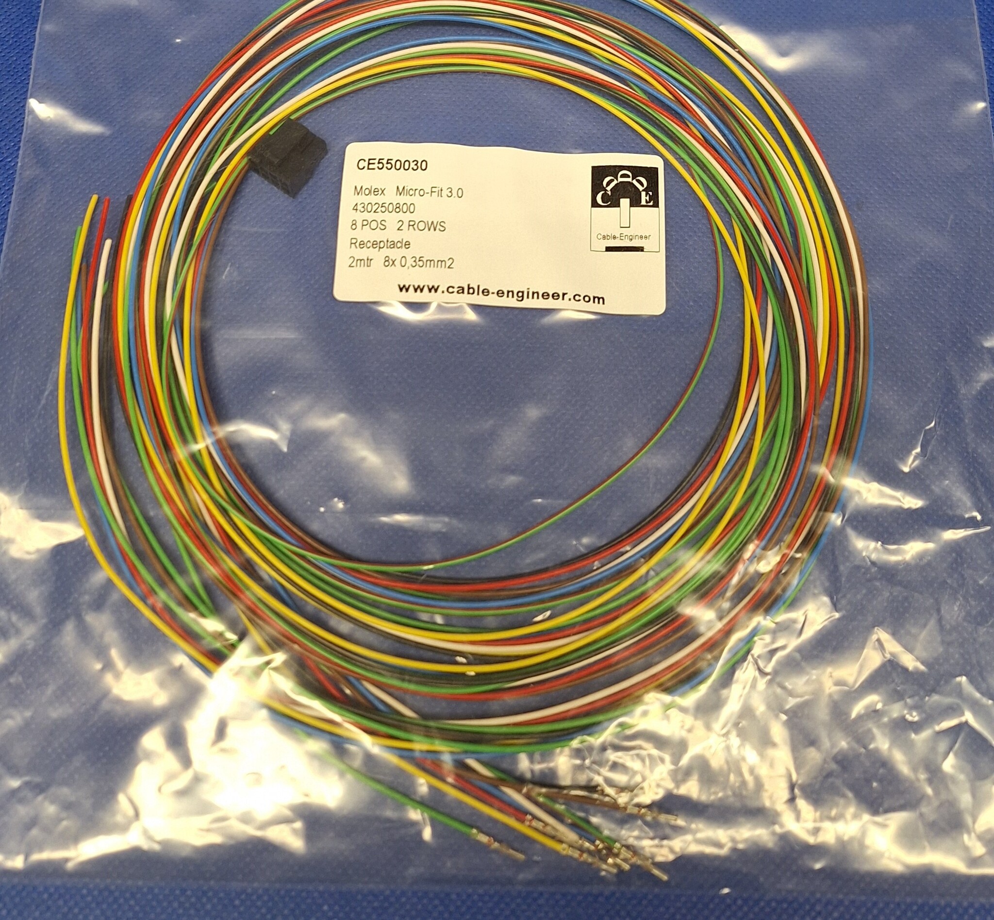 Kant en klare set, klaar voor gebruik van Molex Micro Fit 3.0 Serie. Complete set met Molex Micro Fit 3.0 Receptacle Housing - 8-posities - 2-rij compleet met 8x 2 meter FLRY-A kabel van 0,35mm2 en pre-crimped contacten aan de kabel