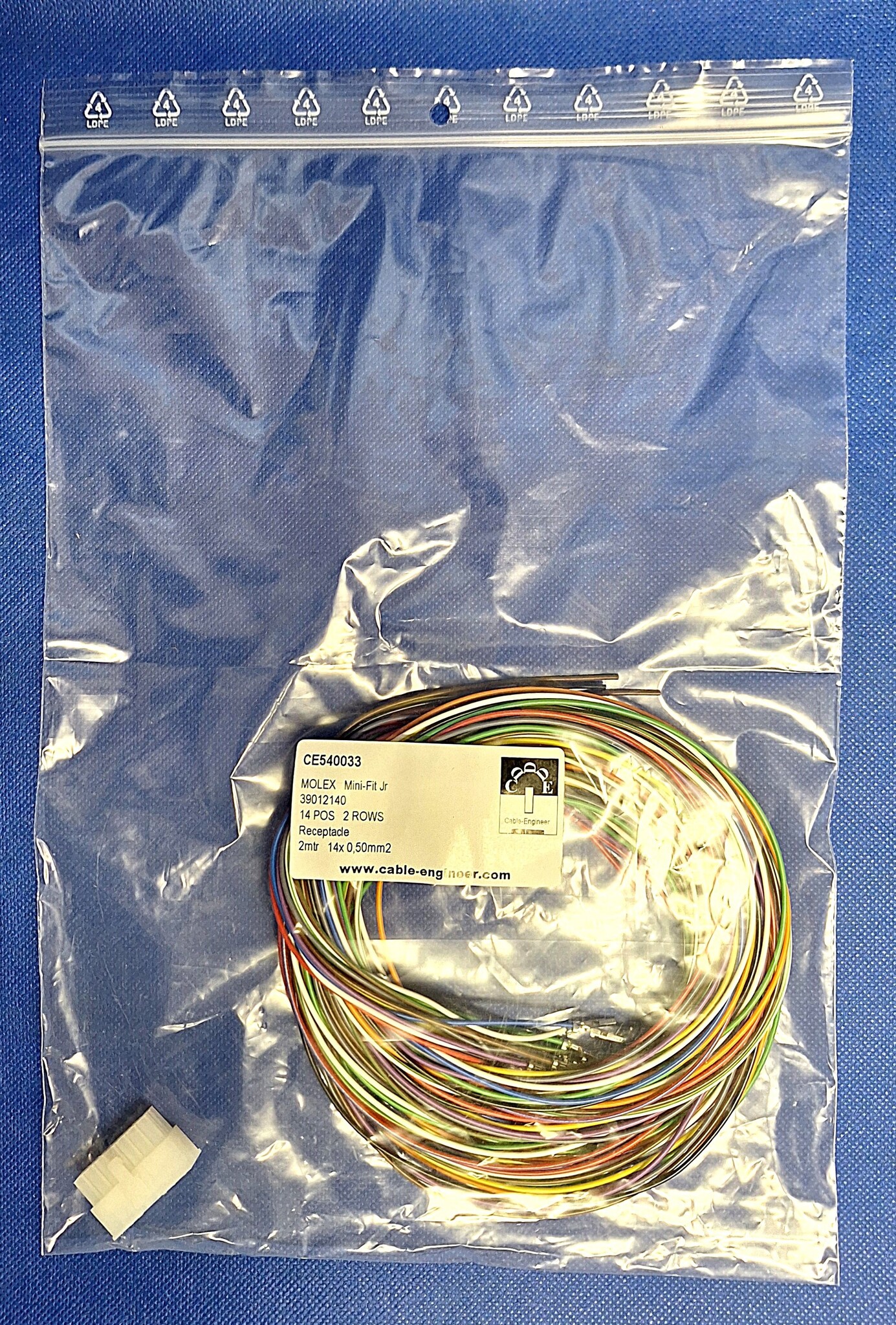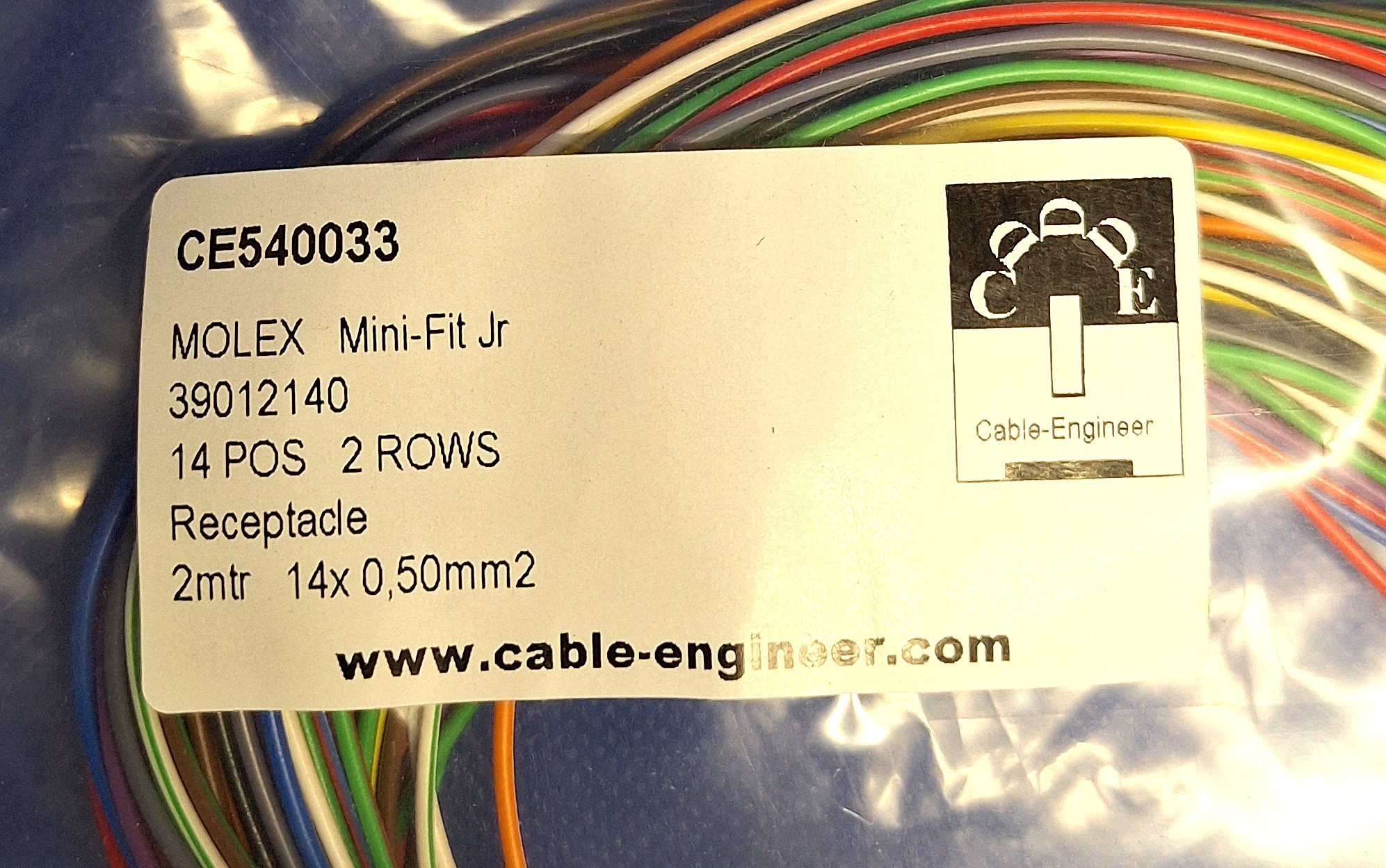 Complete "Pigtail" set met Molex MiniFit Jr. Receptacle Housing 14-Pos. dubbele-rij connector inclusief 14x 2meter 0,50 mm2 FLRY-B voertuigkabel kabel met professioneel gekrompen contacten klaar voor gebruik. Per set verpakt in afsluitbare Zipper-bag