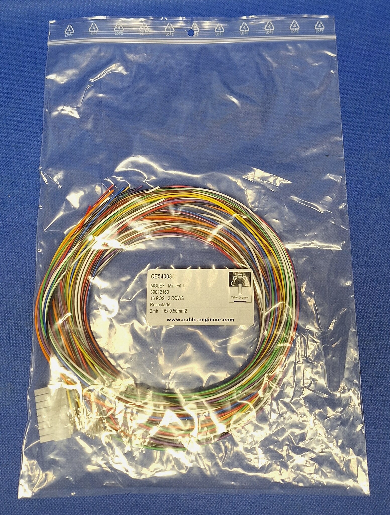 Complete "Pigtail" set met Molex MiniFit Jr. Receptacle Housing 16-Pos. dubbele-rij connector inclusief 16x 2meter 0,50 mm2 FLRY-B voertuigkabel kabel met professioneel gekrompen contacten klaar voor gebruik. Per set verpakt in afsluitbare Zipper-bag