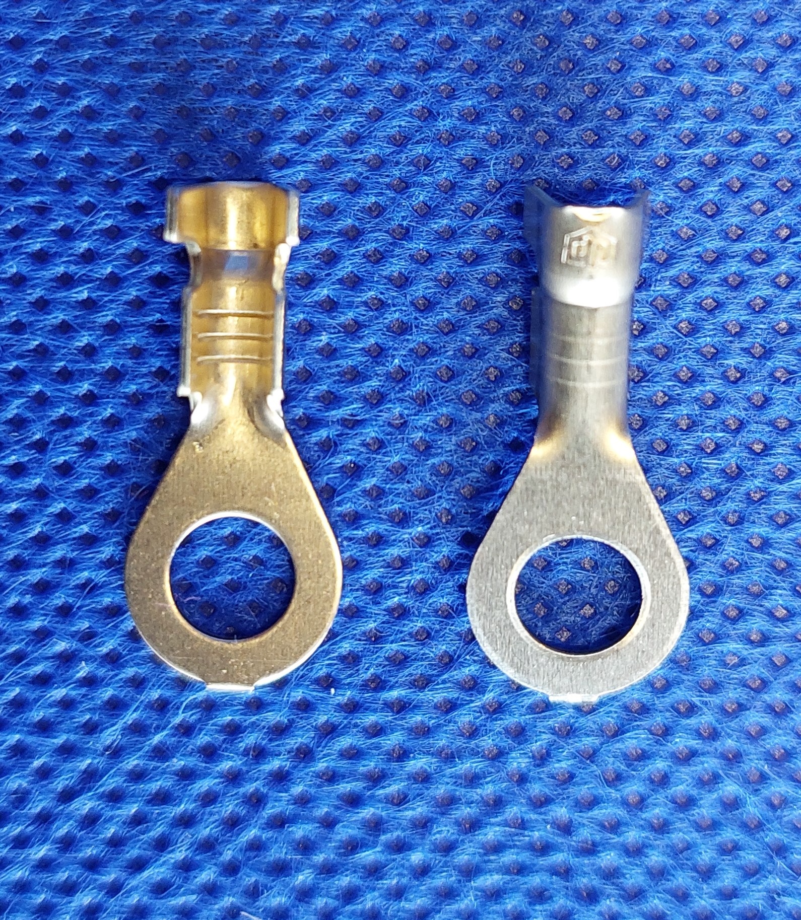 Ring M8 / kabeloog M6 van messing met open-barrel aansluiting voor draad/kabel van 1,0 - 2,5mm2 Per 50 stuks in handige verpakking met ophang-oog.