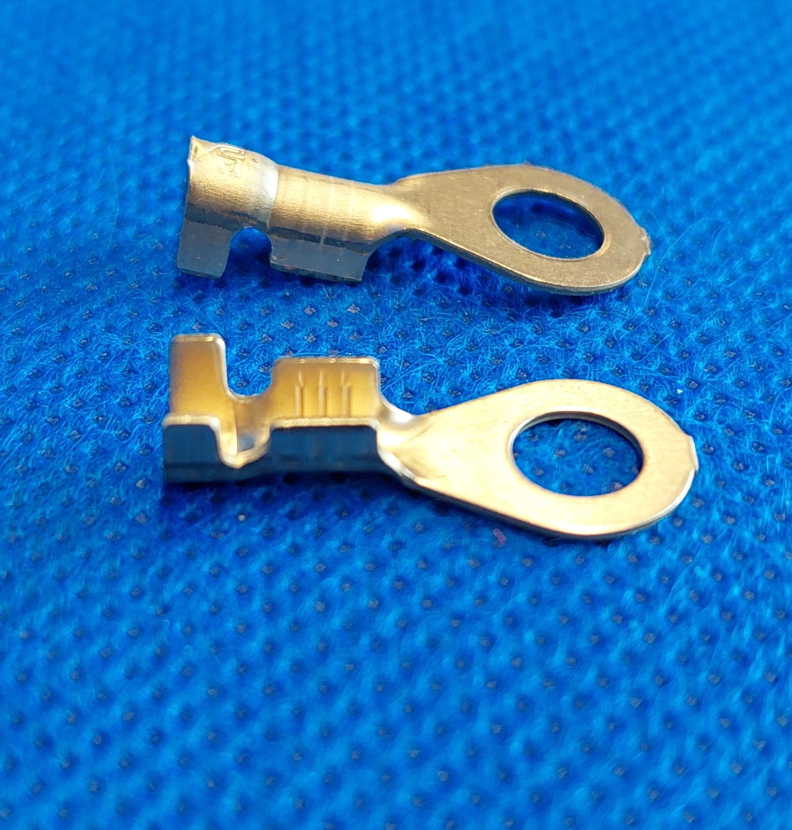 Ring M9 (?) / kabeloog M9 van messing met open-barrel aansluiting voor draad/kabel van 1,0 - 2,5mm2 Per 50 stuks in handige verpakking met ophang-oog.