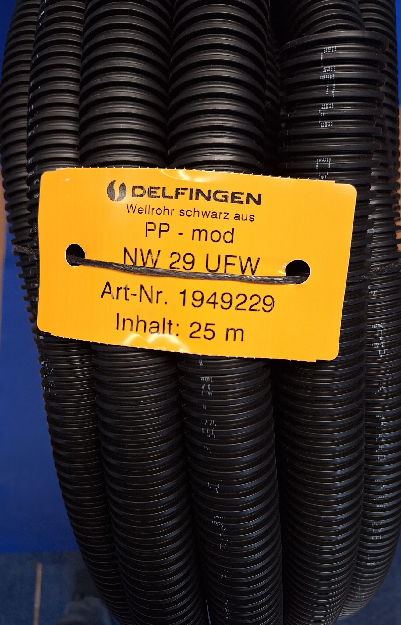 Schlemmer NW29 met split. Uitstekende bescherming van je kabels en elektronica en bestand tegen chemicaliën, bijtende stoffen, corrosie en weersinvloeden en deze buis heeft een bijzonder hoge stootbelasting- 25meter gerold.