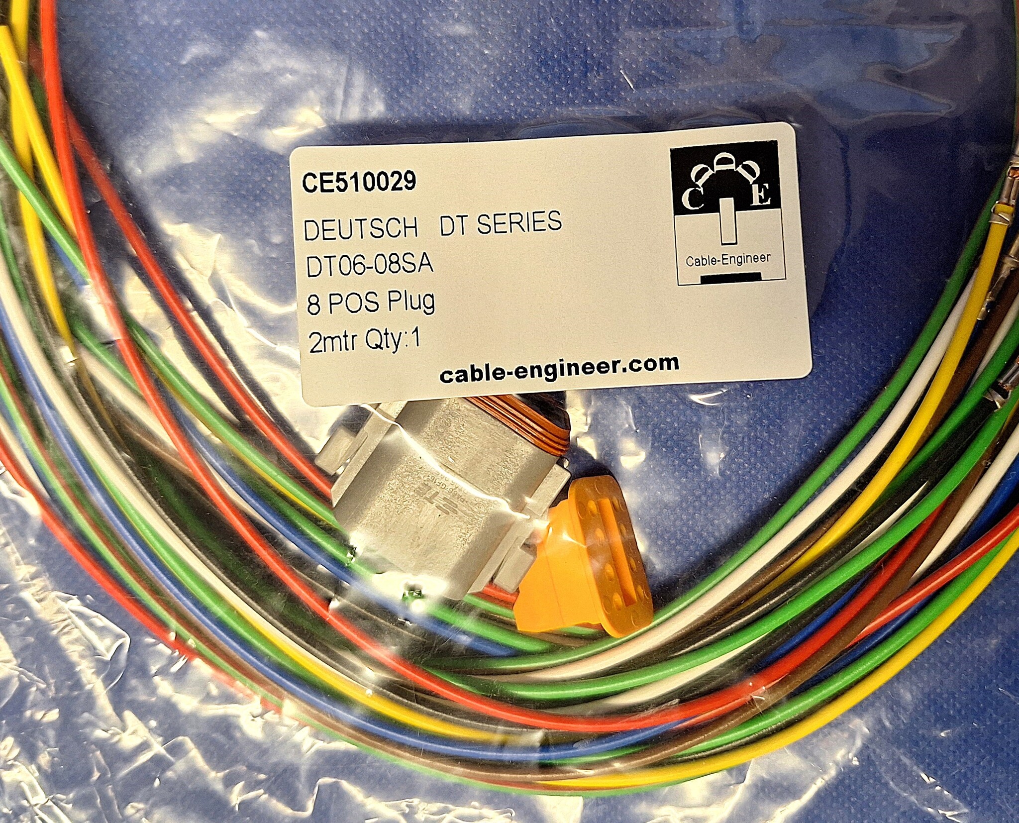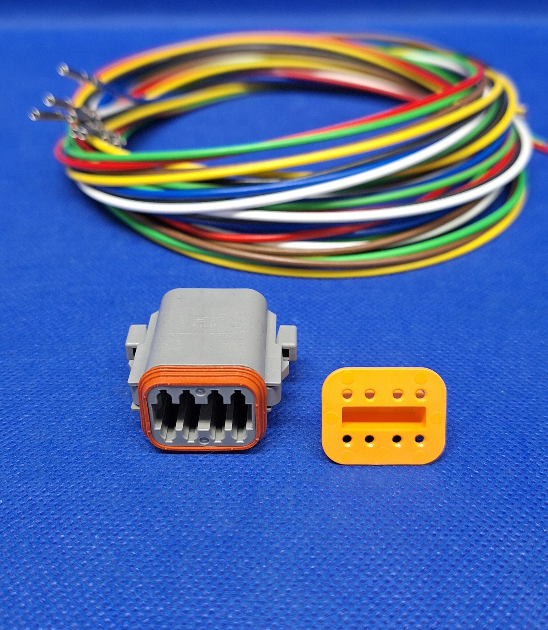 TE Connectivity Deutsch DT Pigtail-set: 8-Pos. Plug DT06-08SA + 8x 2 meter 1,5mm2 FLRY-B kabel met professioneel gemonteerde vrouwelijke Deutsch DT contacten en wedgelock-plug voor het exact uitlijnen en vastzetten van de contacten in de behuizing.