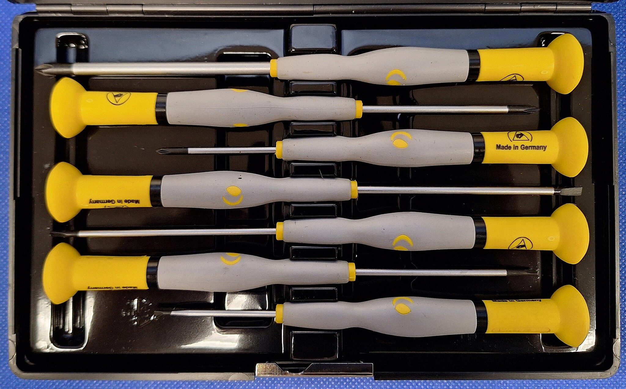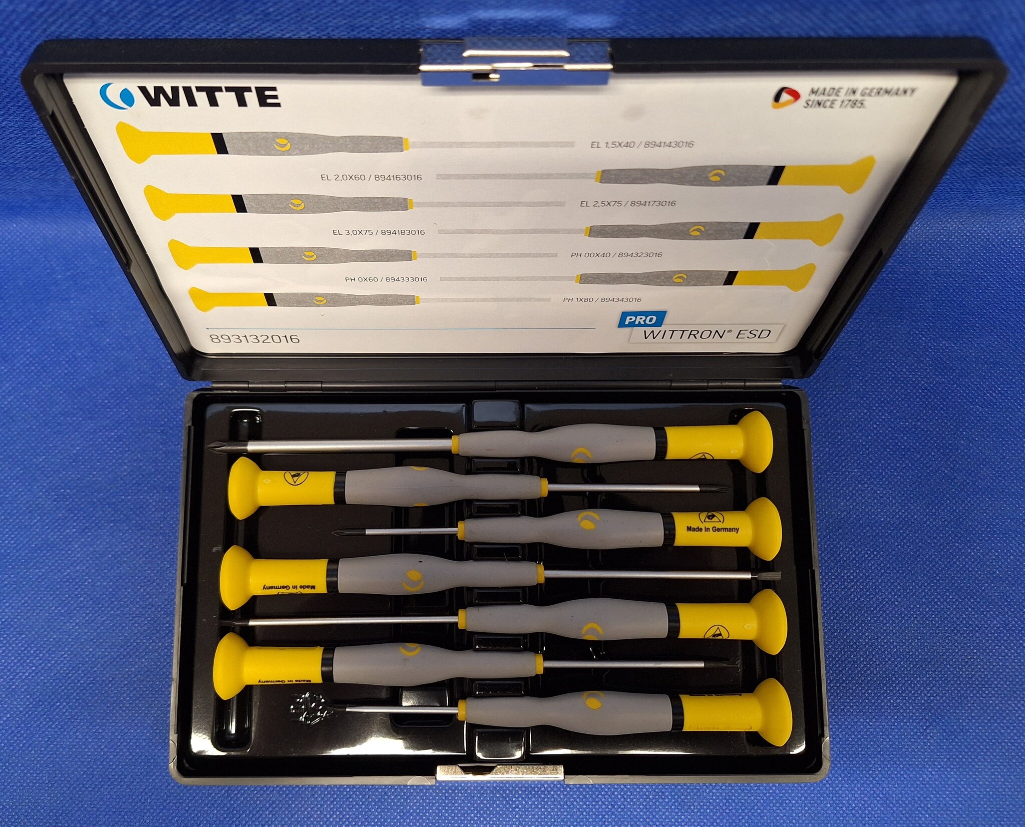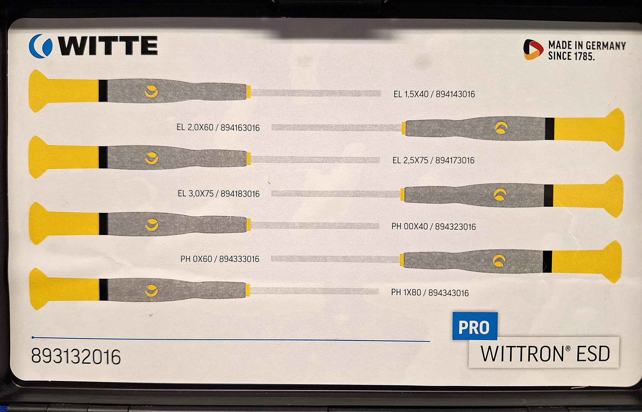 Professionele Pro Wittron® ESD precisie-set van Witte 7 schroevendraaiers: 4x sleuf + 3x kruiskop(PH) opgeborgen in een stevige box. Pro Wittron® is speciaal ontwikkeld voor werken aan elektronische en fijnmechanische componenten met ESD bescherming